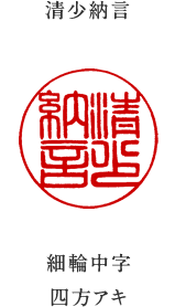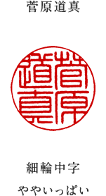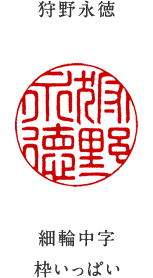 特撰京印章「京の璽」は、書体に印篆(いんてん)を使います。印篆とは中国の漢の時代の銅印の作風を受け継いだ重厚で雅味豊かなものです。宮内庁に保管されている「天皇御璽」「大日本国璽」や紙幣の表面に用いられている「総裁之印」が印篆の代表的な例と言えます。ご注文の際は、上記の4つの見本の中からお選び下さい。書体は同じですが、文字と枠のバランスや文字と枠の太さが変わります。
